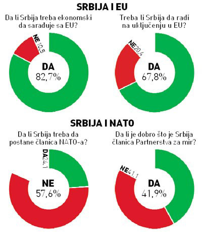 На питање да ли сте за то да Србија ради на прикључењу Европској унији, 67,8 одсто испитаника одговара позитивно, док је 20,4 одсто категорично против прикључења. Међутим, проценат оних који подржавају евроинтеграције расте када је у питању економија, па тако чак 82,7 одсто грађана сматра да Србија треба да развија што тешње економске везе са земљама ЕУ, док је само 10,5 одсто грађана против тога.