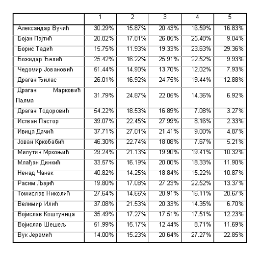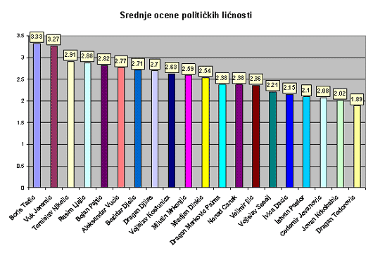 | не зна/ не жели да се изјасни/ без одговора | | Оцена Борис Тадић | 3.38 | | Оцена Војислав Коштуница | 3.12 | | Оцена Вук Јеремић | 3.03 | | Оцена Томислав Николић | 2.88 | | Оцена Александар Вучић | 2.82 | | Оцена Велимир Илић | 2.71 | | Оцена Божидар Ђелић | 2.65 | | Оцена Бојан Пајтић | 2.56 | | Оцена Расим Љајић | 2.56 | | Оцена Драган Ђилас | 2.47 | | Оцена Војислав Шешељ | 2.47 | | Оцена Драган Марковић Палма | 2.42 | | Оцена Милутин Мркоњић | 2.41 | | Оцена Млађан Динкић | 2.41 | | Оцена Ивица Дачић | 2.29 | | Оцена Јован Кркобабић | 2.06 | | Оцена Драган Тодоровић | 2.00 | | Оцена Ненад Чанак | 1.94 | | Оцена Истван Пастор | 1.79 | | Оцена Чедомир Јовановић | 1.59 |