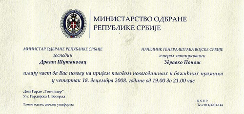 (Време, 25.12.2008) На паркиралишту Дома гарде "Топчидер" 19. децембра, око 19 сати, све је било како треба бити када на пријем поводом новогодишњих и божићних празника зову министар обране и начелник Генералштаба: војна полиција је усмјеравала аутомобиле, црвени тепих на улазу, стасити и непомични гардисти испред врата... Међутим, да све није како треба, министри, дипломате, војни аташеи, новинари и остале угледне званице схватили су чим су дошли надомак свечане салу. Руковали су се, наиме, са министром Драганом Шутановцем и његовим сурадницима из Министарства обране у цивилним одјелима. Од генерала Здравка Поноша и чланова Генералштаба Војске Србије, који би у овој прилици били у свечаним униформама, није било ни трага... Пријем је иначе био као пријем: војни оркестар је свирао, конобари су служили кратка и дуга пића, званице се поздрављале и упознавале. Но, ван круга најупућенијих, нитко није добио одговор на питање које је свима било на уснама. А оно је гласило – гдје је генерал Понош?